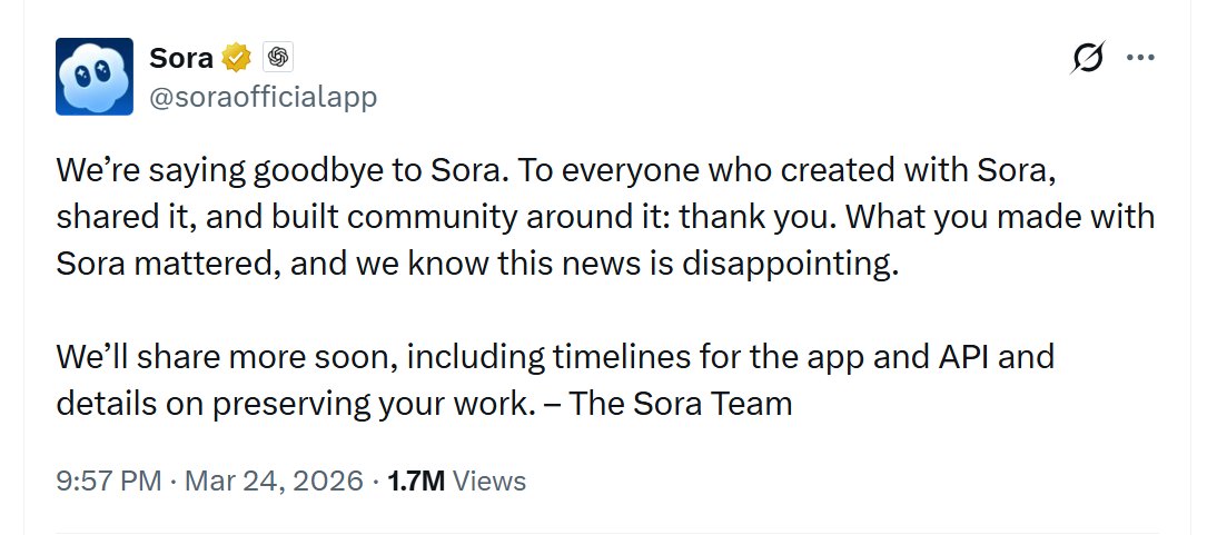 “Mēs atvadāmies no Sora. Paldies visiem, kas radīja kopā ar Sora, dalījās ar to un izveidoja kopienu. Tas, ko jūs darījāt ar Sora, bija svarīgi, un mēs saprotam, ka šīs ziņas var jūs pievilt,” teikts ierakstā Twitter.