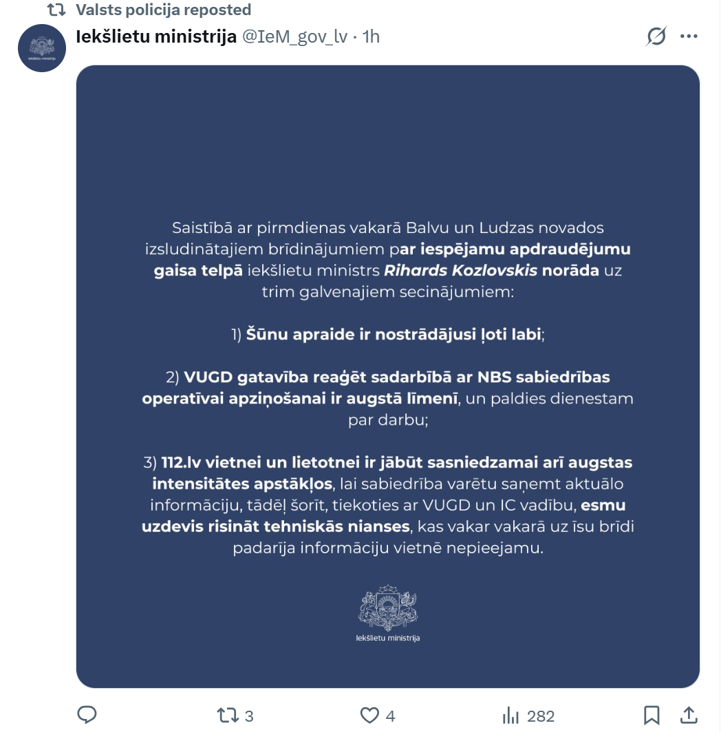 Drona apdraudējums šoreiz izrādījās īslaicīgs un nekaitīgs, taču notikušais jau kārtējo reizi izgaismoja būtisku problēmu – valsts digitālajai krīzes komunikācijai jābūt izturīgākai. Sabiedrības reakcija parādīja, ka cilvēki vēlas skaidru, ātru un uzticamu informāciju, bet amatpersonas sola izvērtēt un uzlabot sistēmas darbību.