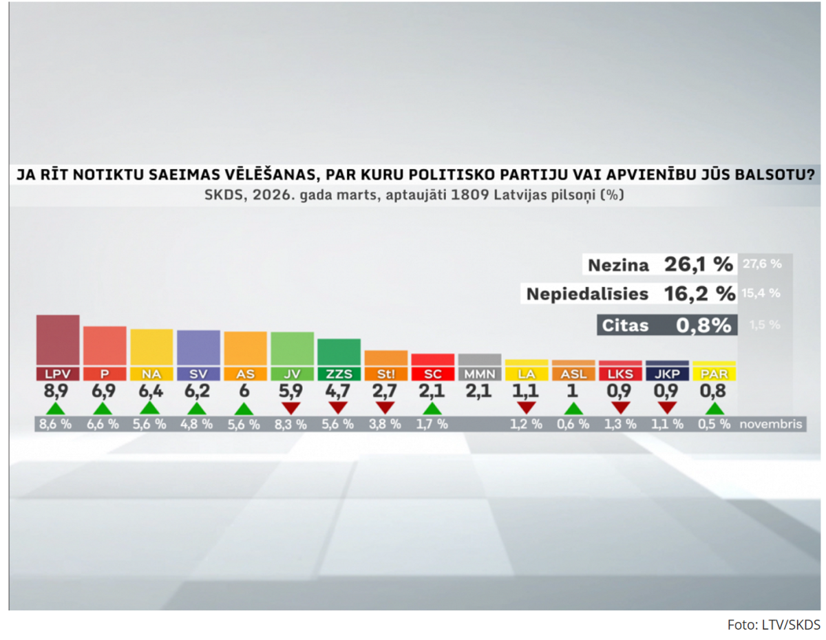 Partiju reitingi martā iezīmē arvien dinamiskāku politisko situāciju, kurā būtisku lomu sāk spēlēt neizlēmušie vēlētāji. Vienlaikus dati parāda arī skaidru tendenci – Jaunās Vienotības atbalsts turpina sarukt, un šī lejupslīde vairs nav īslaicīga svārstība, bet gan noturīgs process. Partija, kas ilgstoši dominēja Latvijas politikā un vadījusi vairākas valdības, pēdējos mēnešos piedzīvo stabilu kritumu. Politologi to skaidro ar vairākiem faktoriem: sabiedrības nogurumu pēc gadiem ilgas atrašanās pie varas, nepopulāriem lēmumiem un iekšējām nesaskaņām, kas kļuvušas redzamākas arī publiskajā telpā. Rezultātā vēlētāji aizvien biežāk izvēlas alternatīvus politiskos spēkus vai pagaidām atturas no izvēles vispār.