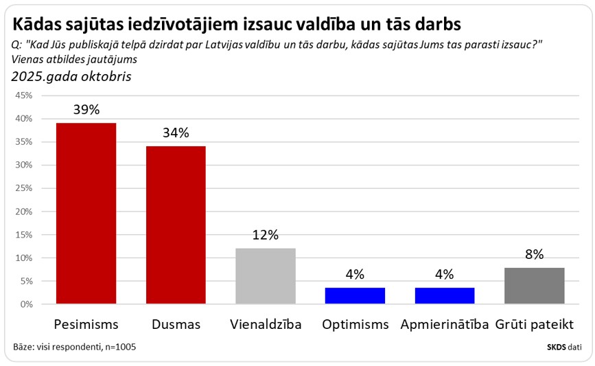 “Lūk, kādas sajūtas Latvijas iedzīvotājiem patlaban rada valdība un tās darbs. Visbiežāk tas ir PESIMISMS (39%) un DUSMAS (34%). Apmēram katram desmitajam tā ir VIENALDZĪBA (12%) un tikai retajam ir APMIERINĀTĪBA (4%) vai OPTIMISMS (4%),” tīklā “X” raksta SKDS vadītājs Arnis Kaktiņš.