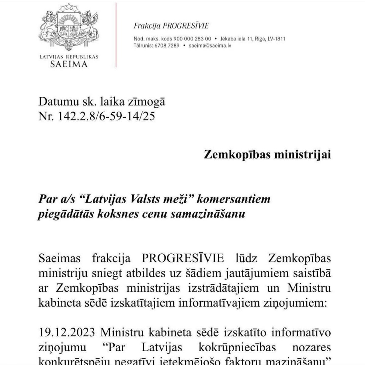 Pirmajā ministrs norāda, ka Zemkopības ministrija no Saeimas frakcijas “Progresīvie” saņēmusi vēstuli ar lūgumu atbildēt uz jautājumiem par pirms diviem gadiem ministrijas sagatavoto un Ministru kabinetā skatīto un pašu “Progresīvo” ministru atbalstīto informatīvo ziņojumu “Par Latvijas kokrūpniecības nozares konkurētspēju negatīvi ietekmējošo faktoru mazināšanu”.